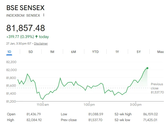 Stock Market Update : भारत और यूरोपीय संघ के बीच हुए ऐतिहासिक व्यापार समझौते (FTA) की खबर से भारतीय शेयर बाजार में हरियाली छा गई। आज (मंगलवार) सेंसेक्स की शुरुआत 81,436 के स्तर पर हुई। कारोबार के दौरान इसमें लगातार बढ़त देखी गई और यह 0.39 प्रतिशत की मजबूती के साथ 81,857 के स्तर पर बंद हुआ। निफ्टी 25,175 पर बंद हुआ।