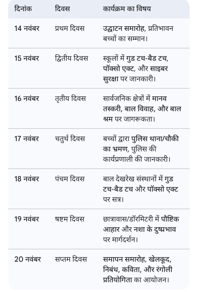 🗓️ सप्ताह भर चलने वाले जागरूकता कार्यक्रम:यह सात दिवसीय अभियान बच्चों और आम जनता को बाल सुरक्षा के विभिन्न पहलुओं के बारे में शिक्षित करने पर केंद्रित होगा: