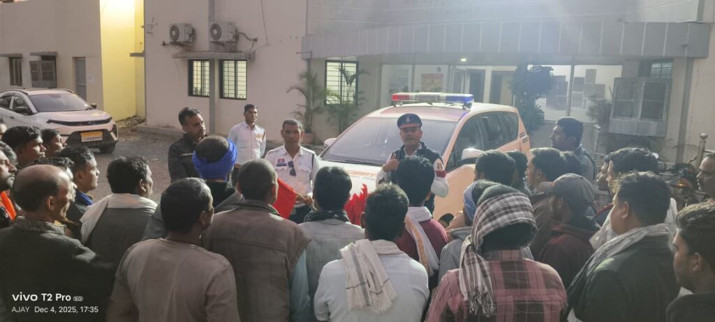 कबीरधाम – पुलिस अधीक्षक धर्मेंद्र सिंह के निर्देशन में यातायात पुलिस टीम ने भोरमदेव शक्कर कारखाना परिसर में विशेष जागरूकता अभियान चलाया गया इस अभियान में किसानों को सड़क सुरक्षा के महत्वपूर्ण बिंदुओं के बारे में जानकारी दी गई और निःशुल्क लाल झंडा, रेडियम स्टिकर और चेतावनी लाइट वितरित की गई। किसानों को गन्ना परिवहन में ओवरलोडिंग न करने, वाहन को नियंत्रित गति में चलाने और रात में अनिवार्य रूप से ट्रॉली के पीछे चेतावनी संकेतों का प्रयोग करने की अपील की गई।