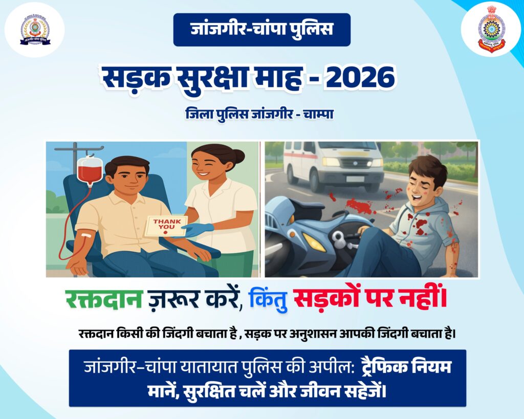 जांजगीर-चांपा। पुलिस मुख्यालय रायपुर के निर्देशानुसार जिले में सड़क सुरक्षा माह कार्यक्रम का आयोजन किया जा रहा है। इसी क्रम में जांजगीर-चांपा पुलिस द्वारा सड़क सुरक्षा माह का शुभारंभ बृहद रक्तदान शिविर के साथ किया जाएगा। यह कार्यक्रम दिनांक 01 जनवरी 2026 को दोपहर 12.00 बजे जांजगीर कचहरी चौक स्थित सी-मार्ट परिसर में आयोजित किया जाएगा।
