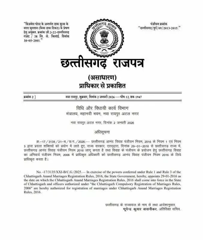 राजपत्र में बताया गया है कि विवाहों के सुचारू और व्यवस्थित पंजीयन के लिए उन्हीं अधिकारियों को अधिकृत किया गया है, जो ‘छत्तीसगढ़ विवाह का अनिवार्य पंजीयन नियम, 2006’ के तहत पहले से कार्यरत हैं। सरकार के इस निर्णय के पीछे कई महत्वपूर्ण सामाजिक और कानूनी उद्देश्य हैं। अनिवार्य विवाह पंजीयन से बाल विवाह जैसी कुप्रथाओं पर प्रभावी रोक लगेगी, वहीं फर्जी विवाह के मामलों में भी कमी आने की उम्मीद है।