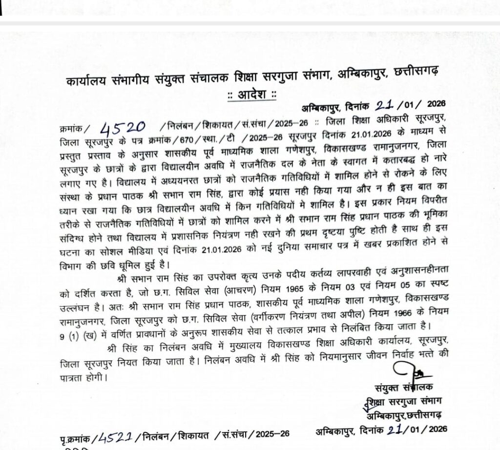 सूरजपुर – शिक्षा विभाग द्वारा कि गई कार्यवाही को लेकर पोस्ट किया जारी,,,,